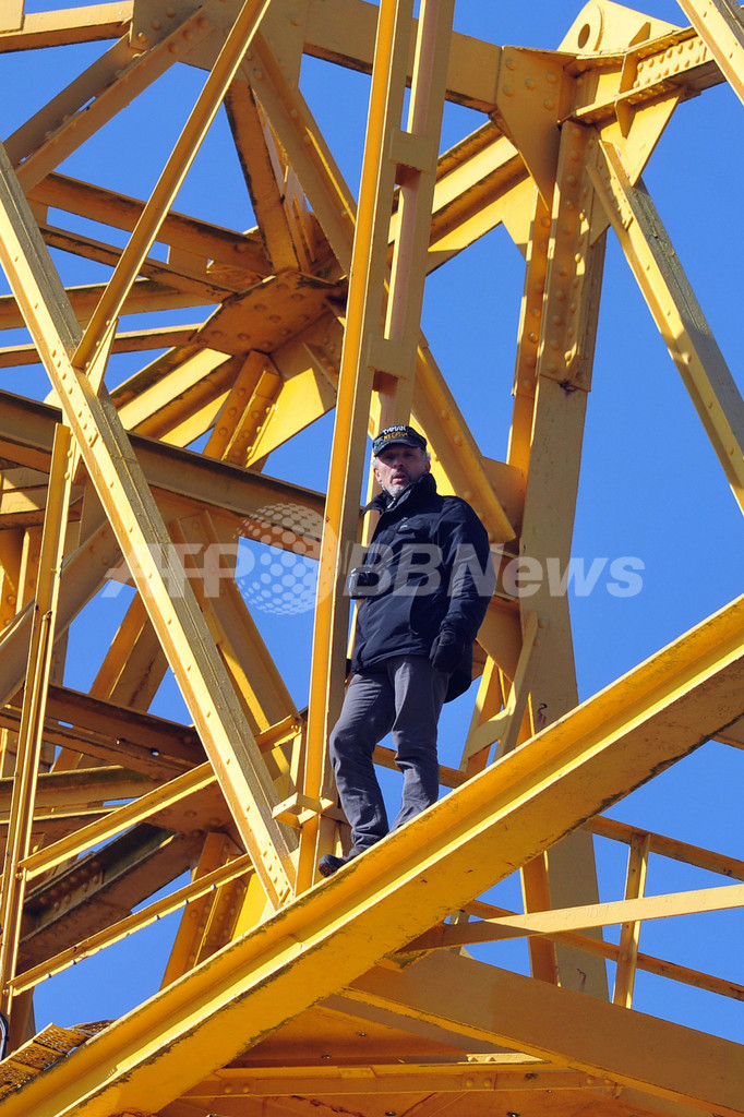 高さ43メートルのクレーンに登ったのは、2006年に誕生した息子の親権を失ったセルジュ・シャルネ( Serge Charnay)さん。息子を誘拐しようとしたとして面接交渉権も失っている。親権をめぐる裁判所命令が「家族と自分の生活を崩壊させた」と訴え、撤回を要求しているシャルネさんは、クレーンの上から携帯電話のテキストメッセージで「はっきりとした進展がない限り、ここにとどまる」と宣言。3月28日に再審理が行われることが決まったことを伝えられた後も降りることを拒否しており、その後、携帯電話のバッテリーが充電切れを起こしてしまったとみられ、当局はシャルネさんとの対話再開の方法を模索しているという。