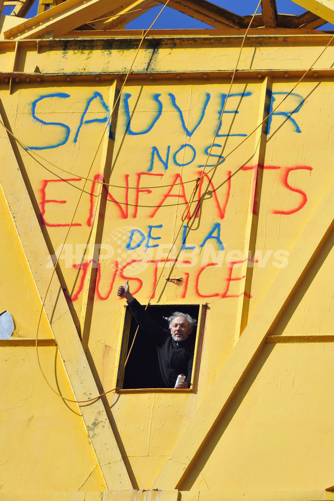 【2月18日 AFP】フランス西部ナント(Nantes)で15日朝、幼い息子との面会を禁じられた父親(42)が造船所の巨大クレーンの上によじ登り、裁判所命令の撤回を求めた。この父親は、裁判所命令が解かれるまでクレーン上に居座ると宣言しており、「(息子の)ブノワには2年も父親がいない」と書かれた大きな横断幕を掲げたまま、17日になっても降りてくる気配を見せていない。