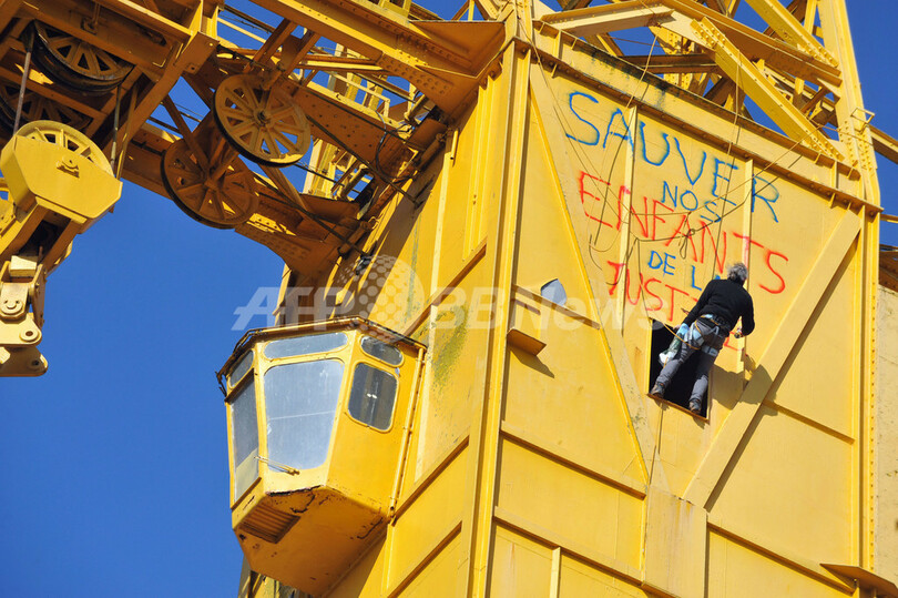 【2月18日 AFP】フランス西部ナント(Nantes)で15日朝、幼い息子との面会を禁じられた父親(42)が造船所の巨大クレーンの上によじ登り、裁判所命令の撤回を求めた。この父親は、裁判所命令が解かれるまでクレーン上に居座ると宣言しており、「(息子の)ブノワには2年も父親がいない」と書かれた大きな横断幕を掲げたまま、17日になっても降りてくる気配を見せていない。