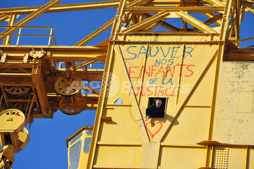 【2月18日 AFP】フランス西部ナント(Nantes)で15日朝、幼い息子との面会を禁じられた父親(42)が造船所の巨大クレーンの上によじ登り、裁判所命令の撤回を求めた。この父親は、裁判所命令が解かれるまでクレーン上に居座ると宣言しており、「(息子の)ブノワには2年も父親がいない」と書かれた大きな横断幕を掲げたまま、17日になっても降りてくる気配を見せていない。