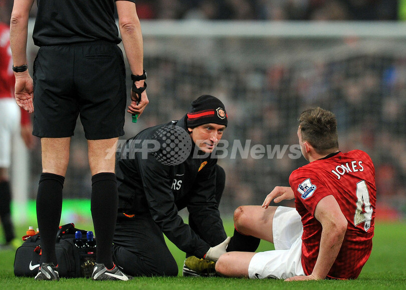 前半途中に負傷したマンチェスター・ユナイテッドのフィル・ジョーンズ(Phil Jones、2013年2月18日撮影)。(c)AFP/PAUL ELLIS