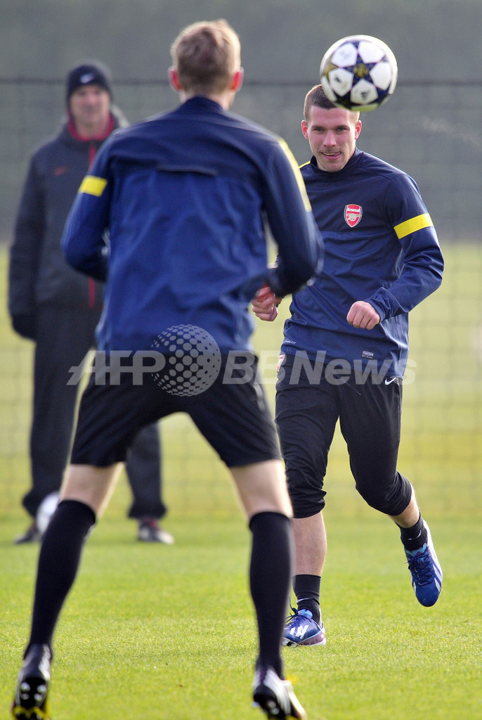 チームメイトのペア・メルテザッカー(Per Mertesacker、左)とともに練習に臨むアーセナルのルーカス・ポドルスキー(Lukas Podolski、2013年2月18日撮影)。(c)AFP/GLYN KIRK
