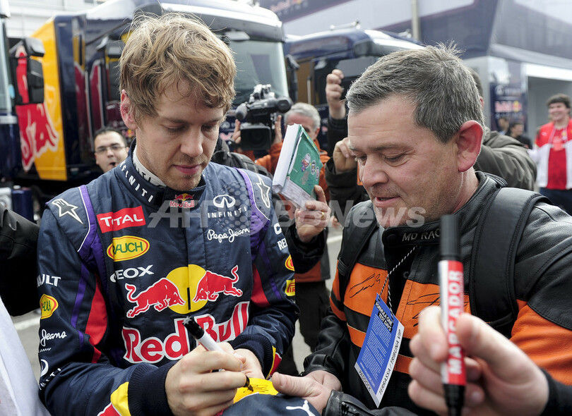 サインに応じるレッドブル(Red Bull)のセバスチャン・ベッテル(Sebastian Vettel、左、2013年2月19日撮影)。(c)AFP/JOSEP LAGO