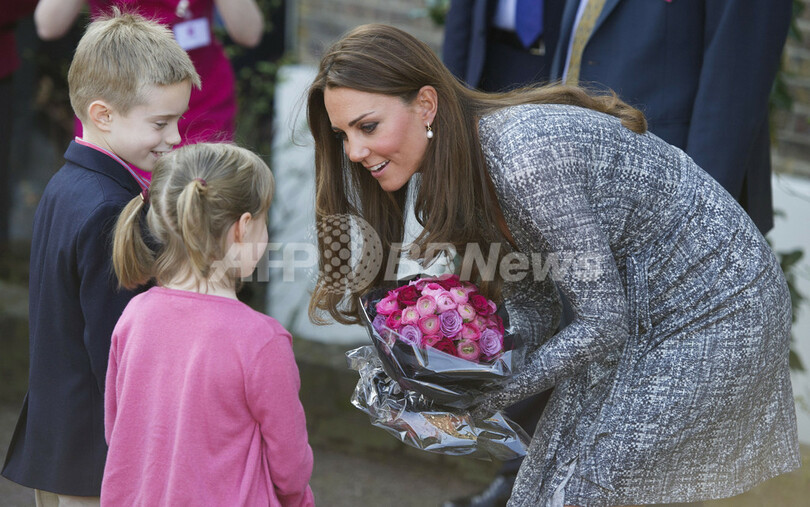 写真は、同施設で子どもたちから花束を受け取るキャサリン妃(2013年2月19日撮影)。(c)AFP/CARL COURT