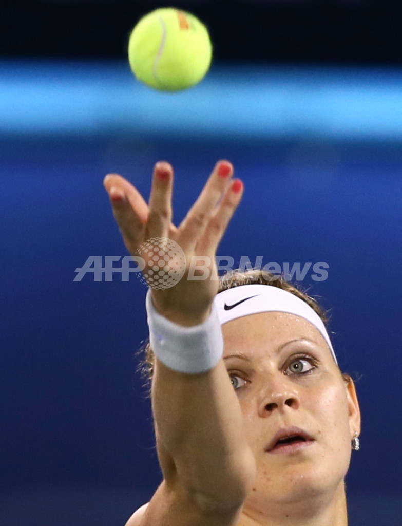 サーブトスを上げるルーシー・サファロワ(2013年2月19日撮影)。(c)AFP/MARWAN NAAMANI