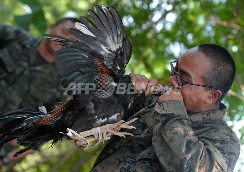 写真は、サタヒップ(Sattahip)の海軍基地で行われたジャングルサバイバルプログラムで、絞めたニワトリにかぶりつく米海兵隊員(2013年2月20日撮影)。(c)AFP/PORNCHAI KITTIWONGSAKUL