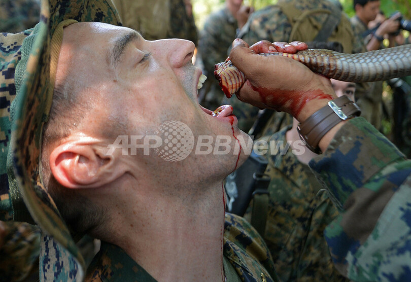 写真は、サタヒップ(Sattahip)の海軍基地で行われたジャングルサバイバルプログラムで、コブラの血を飲む米海兵隊員(2013年2月20日撮影)。(c)AFP/PORNCHAI KITTIWONGSAKUL