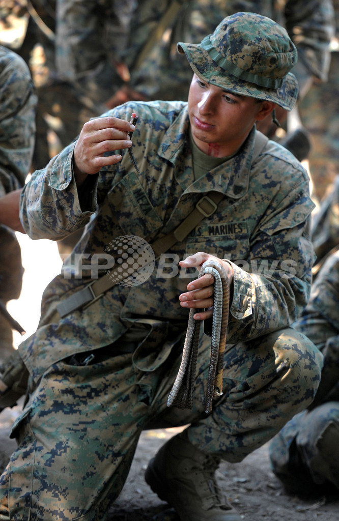 写真は、サタヒップ(Sattahip)の海軍基地で行われたジャングルサバイバルプログラムで、コブラの皮を手にする米海兵隊員(2013年2月20日撮影)。(c)AFP/PORNCHAI KITTIWONGSAKUL