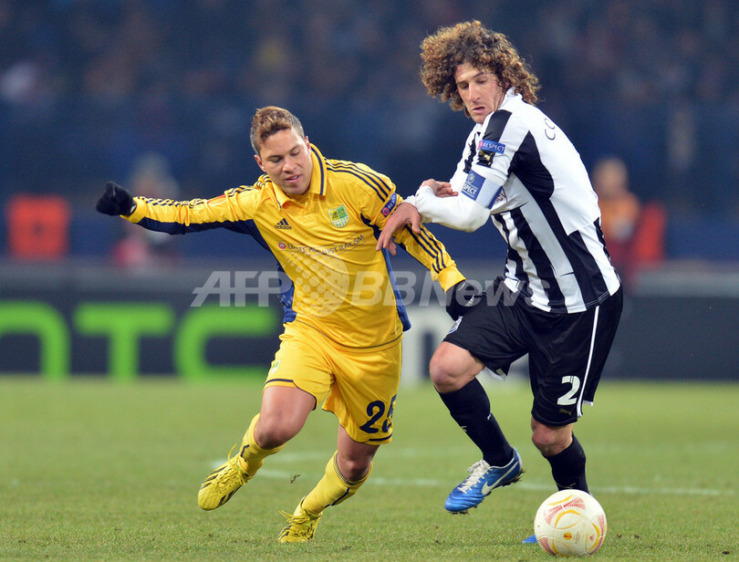 メタリスト・ハルキフの(Marlos Romero Bonfim、左)とボールを競るニューカッスルのファブリシオ・コロッチーニ(Fabricio Coloccini、2013年2月21日撮影)。(c)AFP/SERGEI SUPINSKY