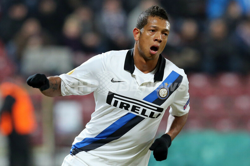 前半22分に先制点を挙げて喜ぶインテルのフレディ・グアリン(Fredy Guarin、2013年2月21日撮影)。(c)AFP/MIRCEA ROSCA