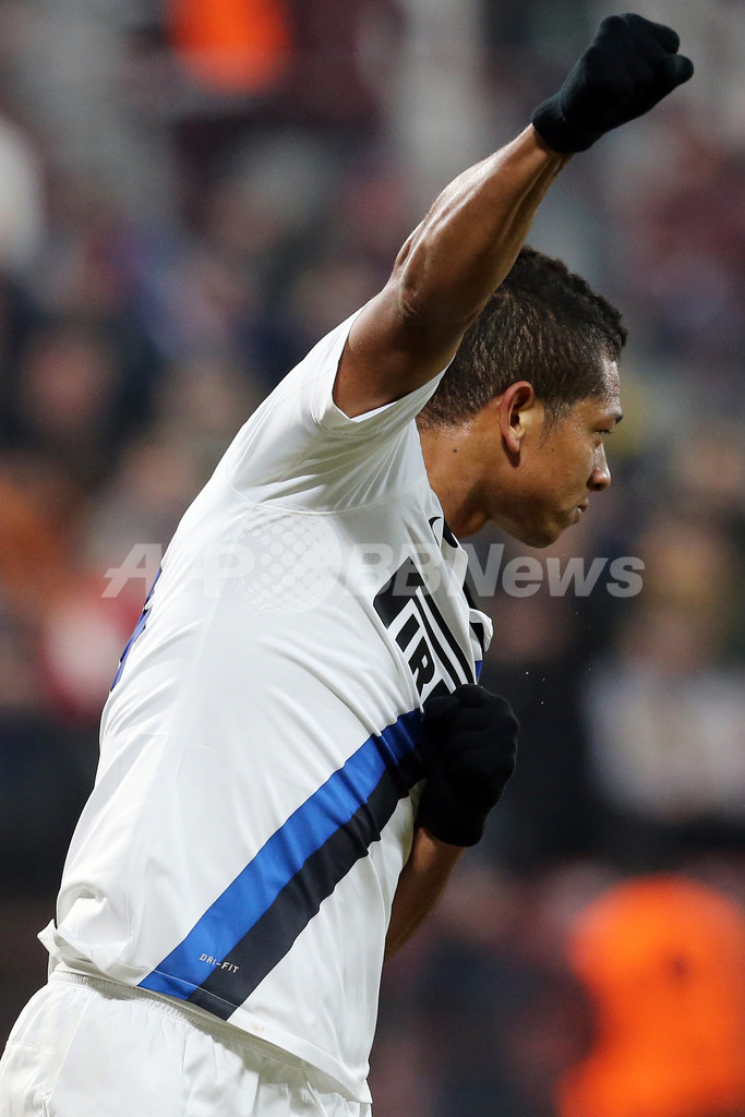 前半22分に先制点を挙げて喜ぶインテルのフレディ・グアリン(Fredy Guarin、2013年2月21日撮影)。(c)AFP/MIRCEA ROSCA