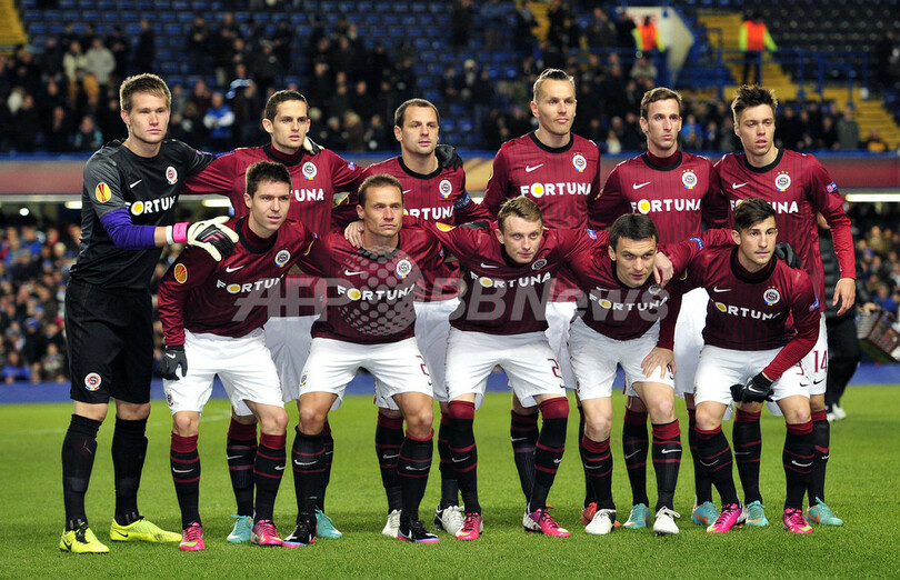 試合前の写真撮影に臨むスパルタ・プラハの選手(2013年2月21日撮影)。(c)AFP/GLYN KIRK