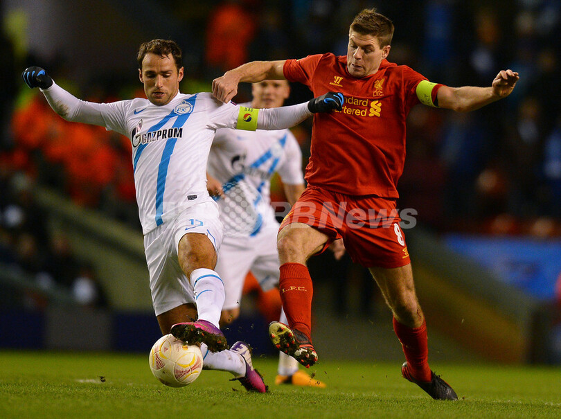 ゼニト・サンクトペテルブルクのロマン・シロコフ(Roman Shirokov)とボールを競るリバプールのスティーブン・ジェラード(Steven Gerrard、2013年2月21日撮影)。(c)AFP/ANDREW YATES