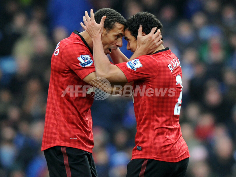前半23分に先制点を挙げて、チームメイトのリオ・ファーディナンド(Rio Ferdinand、左)と喜びを分かち合うマンチェスター・ユナイテッドのラファエウ・ダ・シウバ(Rafael da Silva、2013年2月23日撮影)。(c)AFP/OLLY GREENWOOD