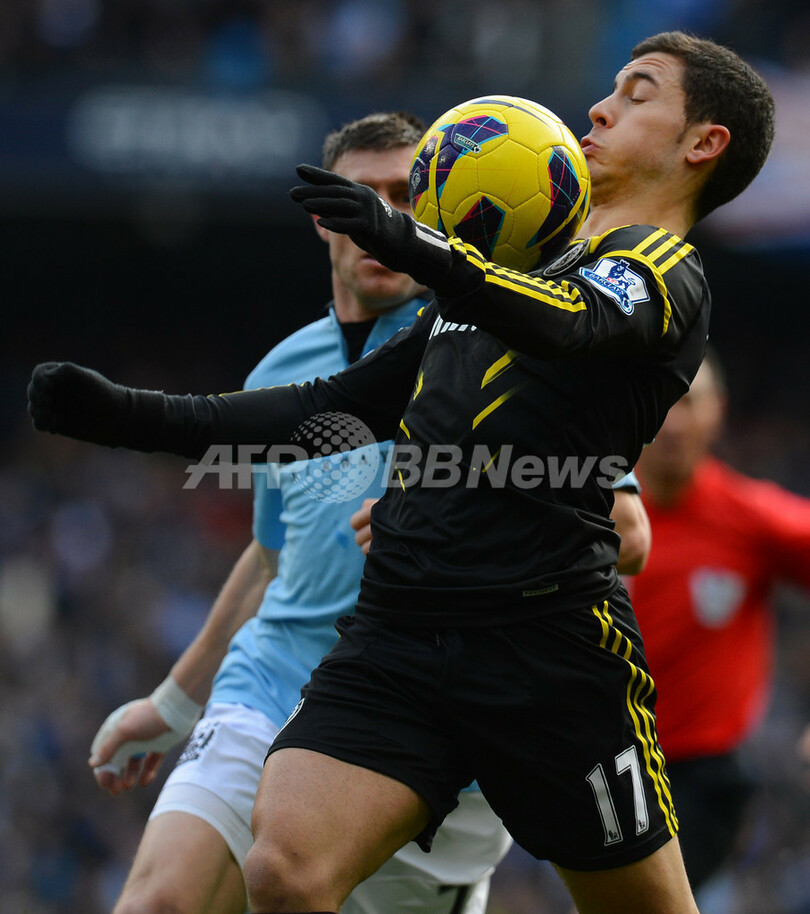 ボールをコントロールするチェルシーのエデン・アザール(Eden Hazard、2013年2月24日撮影)。(c)AFP/ANDREW YATES