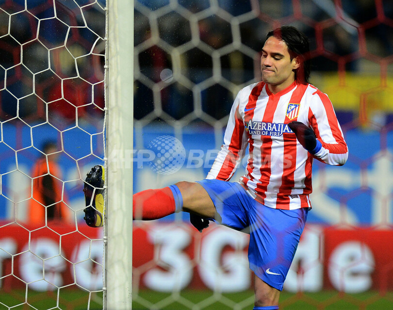 ポストを蹴るアトレティコ・マドリードのラダメル・ファルカオ・ガルシア(Radamel Falcao Garcia、2013年2月24日撮影)。(c)AFP/PIERRE-PHILIPPE MARCOU