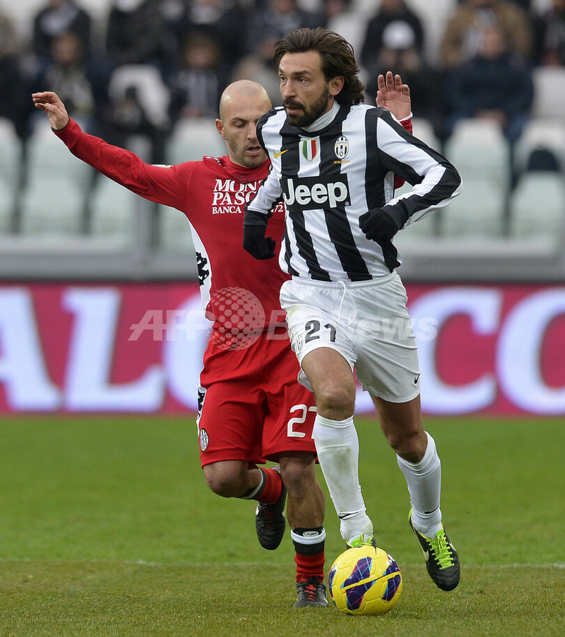 シエナのアレッサンドロ・ロジーナ(Alessandro Rosina、左)の前でボールをコントロールするユベントスのアンドレア・ピルロ(Andrea Pirlo、2013年2月24日撮影)。(c)AFP/ALBERTO LINGRIA