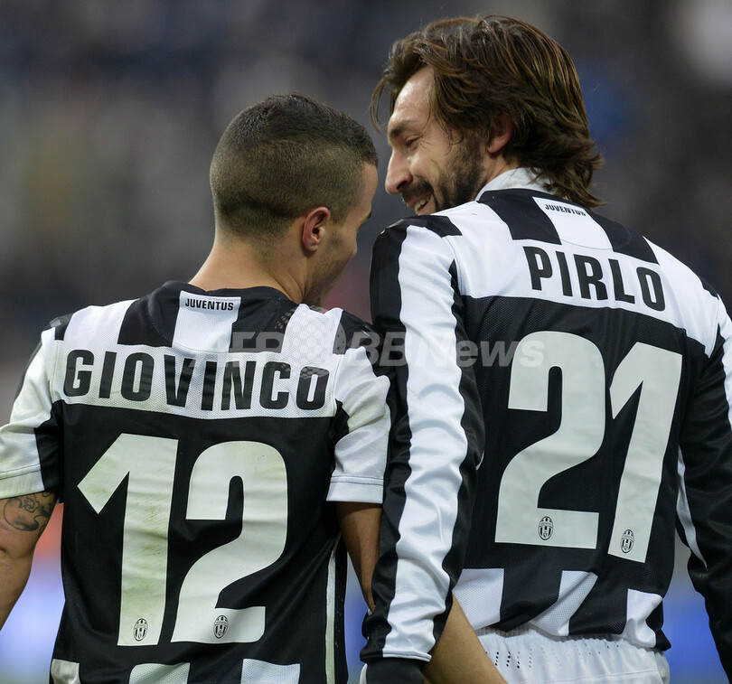 後半29分にチーム2得点目を挙げ、チームメイトのアンドレア・ピルロ(Andrea Pirlo、右)に祝福されるユベントスのセバスティアン・ジオビンコ(Sebastian Giovinco、2013年2月24日撮影)。(c)AFP/ALBERTO LINGRIA