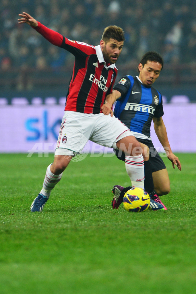 ボールを競るACミランのアントニオ・ノチェリーノ(Antonio Nocerino、左)とインテルの長友佑都(Yuto Nagatomo、2013年2月24日撮影)。(c)AFP/GIUSEPPE CACACE