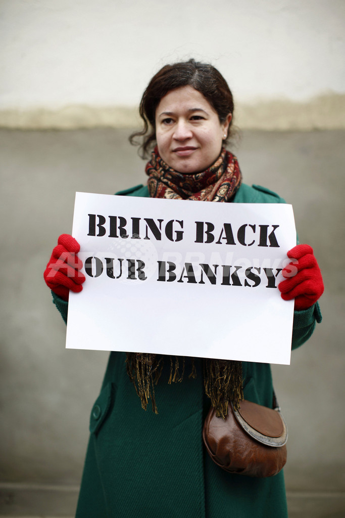 写真は、バンクシー(Banksy)氏の壁画が持ち去られた後の壁にたって抗議する女性(2013年2月23日撮影)。(c)AFP/JUSTIN TALLIS