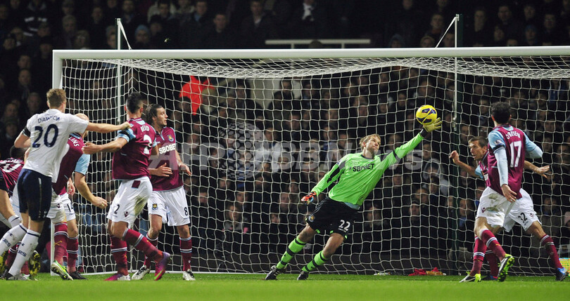 シュートをセーブするウェストハムのGKユシ・ヤースケライネン(Jussi Jaaskelainen、中央、2013年2月25日撮影)。(c)AFP/GLYN KIRK