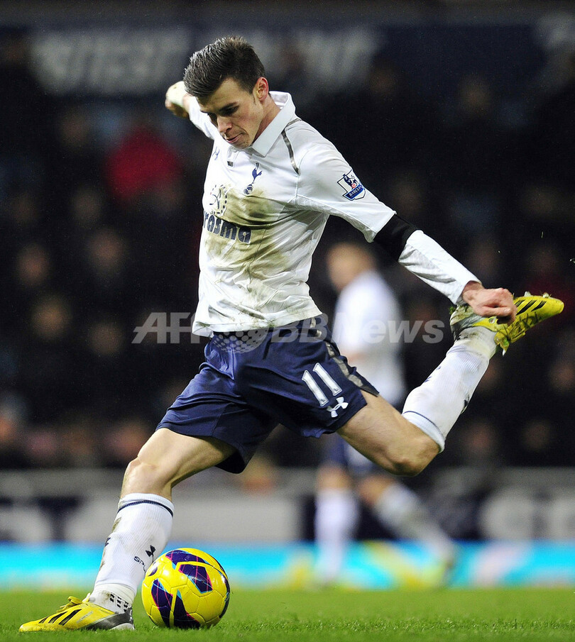 試合終了間際に決勝点を決めるトッテナムのギャレス・ベイル(Gareth Bale、2013年2月25日撮影)。(c)AFP/GLYN KIRK