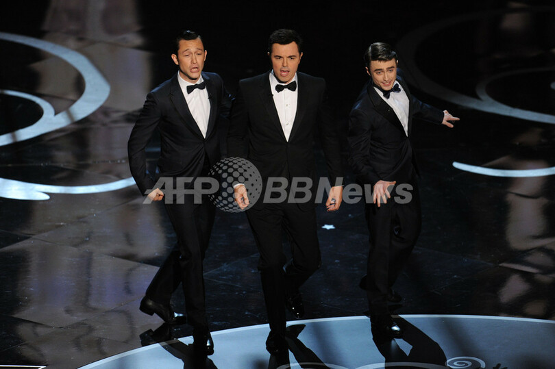 現地時間24日に開催された第85回アカデミー賞(Academy Awards)授賞式のワンシーン。写真は、司会を務めたセス・マクファーレン(Seth MacFarlane、中央)とともに歌うジョセフ・ゴードン・レヴィット(Joseph Gordon-Levitt、左)とダニエル・ラドクリフ(Daniel Radcliffe、2013年2月24日撮影)。(c)AFP/Robyn BECK