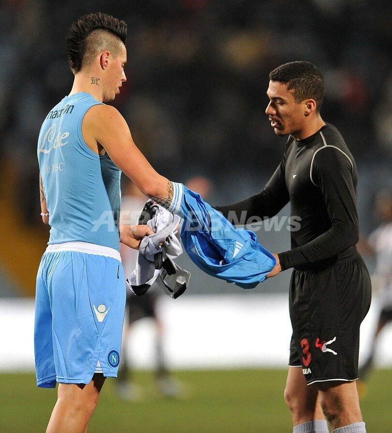 試合後にユニホームを交換するウディネーゼのアラン・マルケス・ロウレイロ(Allan Marques Loureiro、右)とナポリのマレク・ハムシク(Marek Hamsik、2013年2月25日撮影)。(c)AFP/SIMONE FERRARO