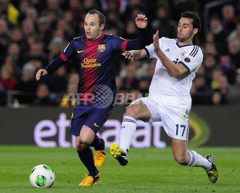 FCバルセロナのアンドレス・イニエスタ(Andres Iniesta、左)とボールを競るレアル・マドリードのアルバロ・アルベロア(Alvaro Arbeloa、2013年2月26日撮影)。(c)AFP/JOSEP LAGO