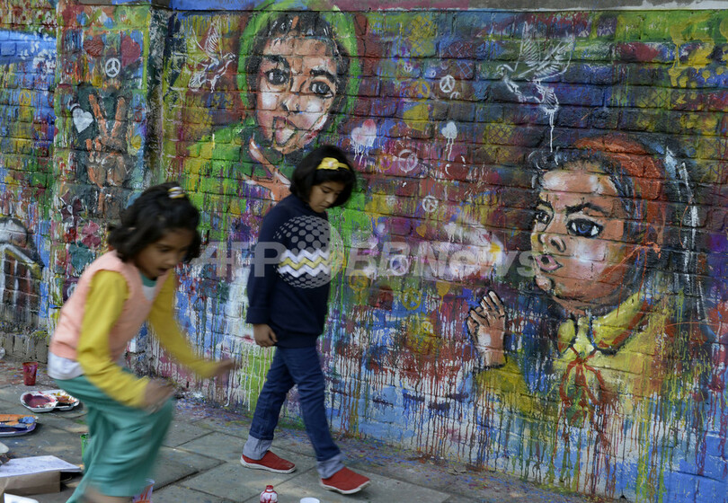 写真はウォールアートの前を歩くインドの子どもたち(2013年2月24日撮影)。(c)AFP/SAJJAD HUSSAIN