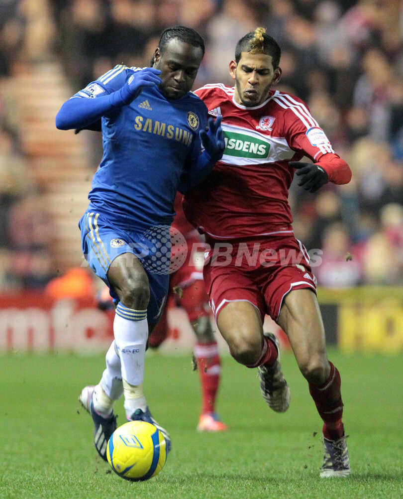 ボールを競るミドルスブラのファリス・ハルーン(Faris Haroun、右)とチェルシーのビクター・モーゼス(Victor Moses、2013年2月27日撮影)。(c)AFP/LINDSEY PARNABY