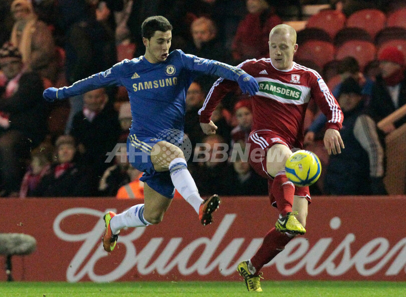ボールを競るミドルスブラのニッキー・ベイリー(Nicky Bailey、右)とチェルシーのエデン・アザール(Eden Hazard、2013年2月27日撮影)。(c)AFP/LINDSEY PARNABY