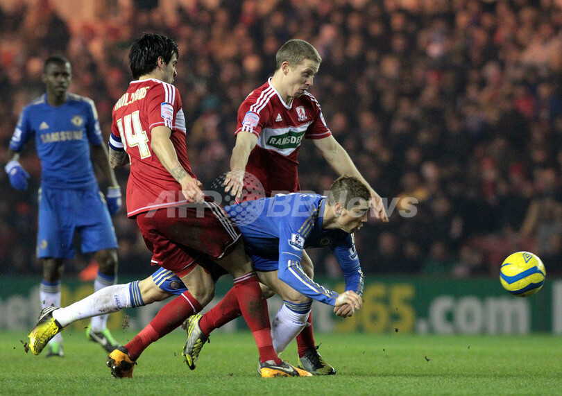 ミドルスブラの守備陣と競り合いバランスを崩すチェルシーのフェルナンド・トーレス(Fernando Torres、中央、2013年2月27日撮影)。(c)AFP/LINDSEY PARNABY