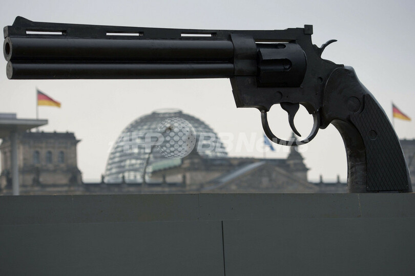 ニュース 戦争・紛争 巨大ピストルで武器輸出にNO! ドイツ 2013年2月28日 12:21 発信地:ベルリン/ドイツ [ ヨーロッパ ドイツ ] このニュースをシェア ‹ › ❮ 4/4 ❯ ドイツ・ベルリン(Berlin)の連邦議会議事堂前に反戦活動家らが設置した巨大な拳銃のオブジェ(2013年2月26日撮影)。(c)AFP/MAURIZIO GAMBARINI 画像作成中 ! 【2月28日 AFP】ドイツ・ベルリン(Berlin)の連邦議会議事堂前に26日、巨大な拳銃のオブジェが出現した。反戦活動家らが設置したもので、オブジェには「わが国の武器が殺人に使われている。ドイツは世界第3位の武器輸出国だ」とのドイツ政府に向けたメッセージが書かれている。(c)AFP/ MAURIZIO GAMBARINI 戦争・紛争 一覧へ> メディア・報道関係・法人の方向け 写真・動画 購入のお問合せ>