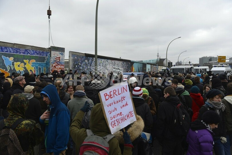 【3月2日 AFP】30年近くにわたり抑圧のシンボルとして嫌悪されてきたベルリンの壁(Berlin Wall)が1日、再び怒りの抗議を引き起こした。新たな住宅地開発計画により、現存する中で最長の壁の撤去作業が開始されたためだ。抗議に集まった老若男女約200人と壁の間には、警察官がいかめしい顔つきで立ちふさがった。