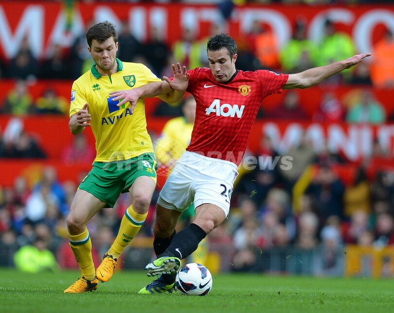 ボールを競るノリッジ・シティのジョニー・ハウソン(Jonny Howson 、左)とマンチェスター・ユナイテッドのロビン・ファン・ペルシー(Robin Van Persie、2013年3月2日撮影)。(c)AFP/ANDREW YATES