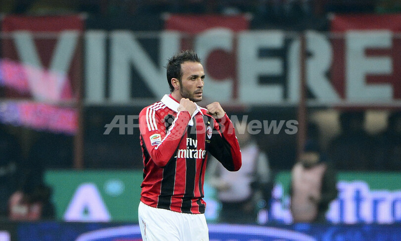 得点を挙げ喜ぶACミランのジャンパオロ・パッツィーニ(Giampaolo Pazzini、2013年3月2日撮影)。(c)AFP/OLIVIER MORIN