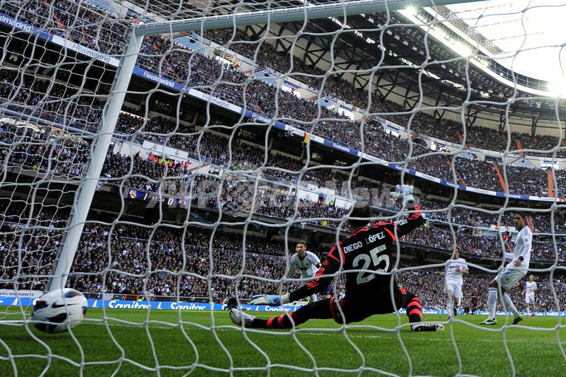 FCバルセロナのリオネル・メッシ(Lionel Messi、写真外)に得点を許すレアル・マドリードのGKディエゴ・ロペス(Diego Lopez、中央、2013年3月2日撮影)。(c)AFP/JAVIER SORIANO