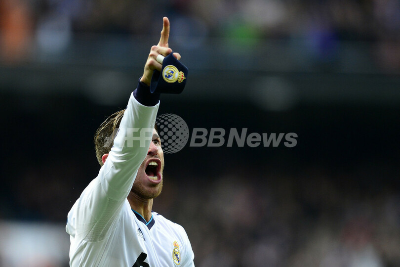 後半37分に勝ち越しゴールを決め歓喜するレアル・マドリードのセルヒオ・ラモス(Sergio Ramos、2013年3月2日撮影)。(c)AFP/JAVIER SORIANO