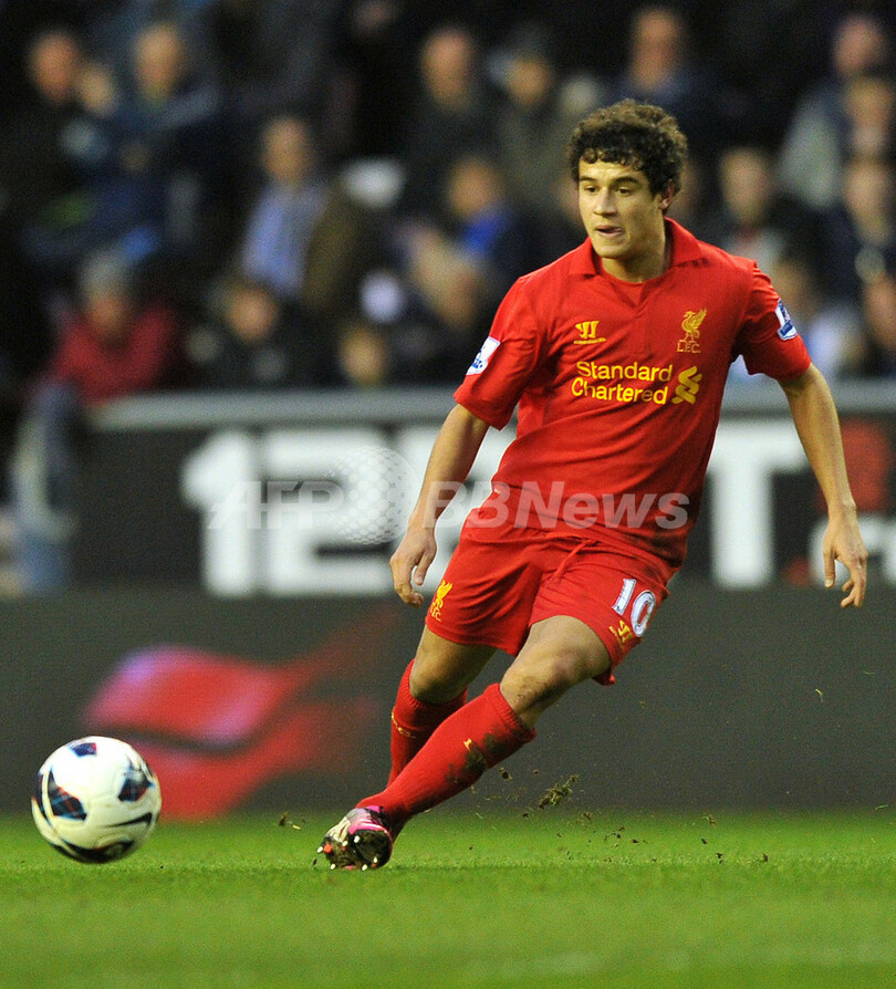 パスを出すリバプールのフィリペ・コウチーニョ・コレイア(Philippe Coutinho Correia、2013年3月2日撮影)。(c)AFP/PAUL ELLIS