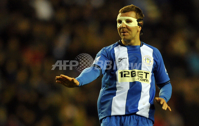 フェイスガードを着用して試合に臨むウィガンのジェームス・マッカーサー(James McArthur)、2013年3月2日撮影)。(c)AFP/PAUL ELLIS