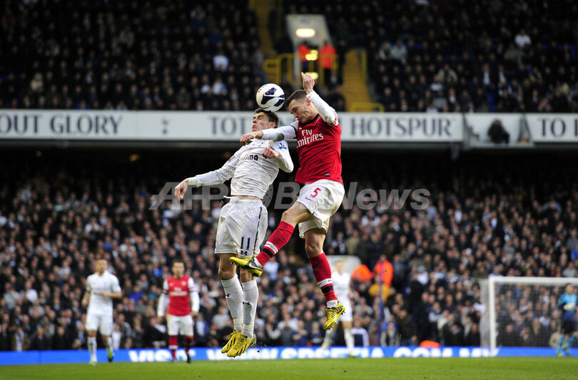 ボールを競るアーセナルのトーマス・フェルマーレン(Thomas Vermaelen、右)とトッテナムのギャレス・ベイル(Gareth Bale、2013年3月3日撮影)。(c)AFP/GLYN KIRK