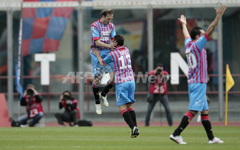 前半19分に追加点を決め、チームメイトと歓喜するカターニアのジョヴァンニ・マルケーゼ(Giovanni Marchese、左、2013年3月3日撮影)。(c)AFP/Marcello PATERNOSTRO