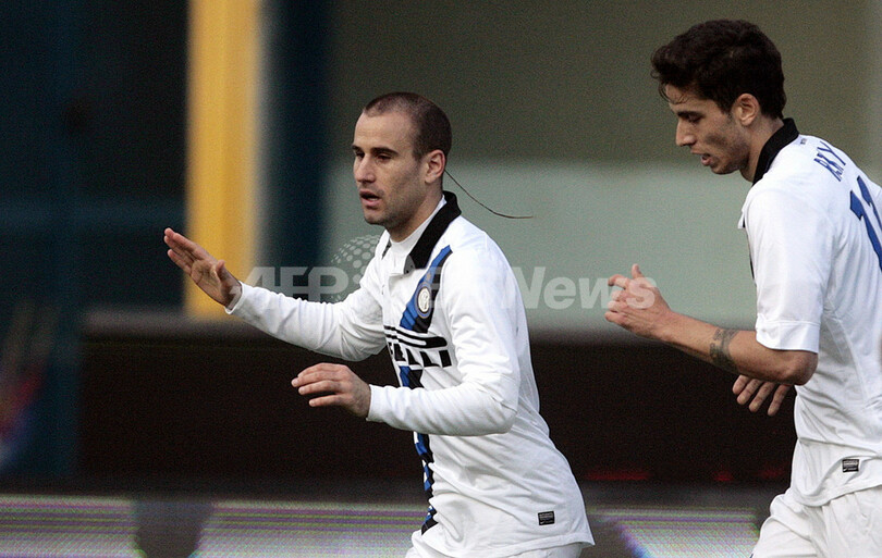 得点を決め喜ぶインテルのロドリゴ・パラシオ(Rodrigo Palacio、左、2013年3月3日撮影)。(c)AFP/Marcello PATERNOSTRO