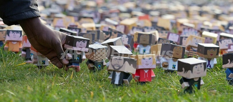 【3月5日 AFP】英ロンドン(London)の国会議事堂前に4日、厚紙で作った数千個の人形が並べられた。フェアトレード基金(Fairtrade Foundation)が主催したもので、6月の主要8か国(G8)首脳会議を前に、デービッド・キャメロン(David Cameron)首相に、世界中の小規模農家を中心に据えた通商政策の立案を求めた。(c)AFP