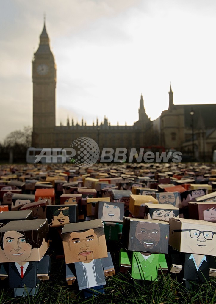 【3月5日 AFP】英ロンドン(London)の国会議事堂前に4日、厚紙で作った数千個の人形が並べられた。フェアトレード基金(Fairtrade Foundation)が主催したもので、6月の主要8か国(G8)首脳会議を前に、デービッド・キャメロン(David Cameron)首相に、世界中の小規模農家を中心に据えた通商政策の立案を求めた。(c)AFP