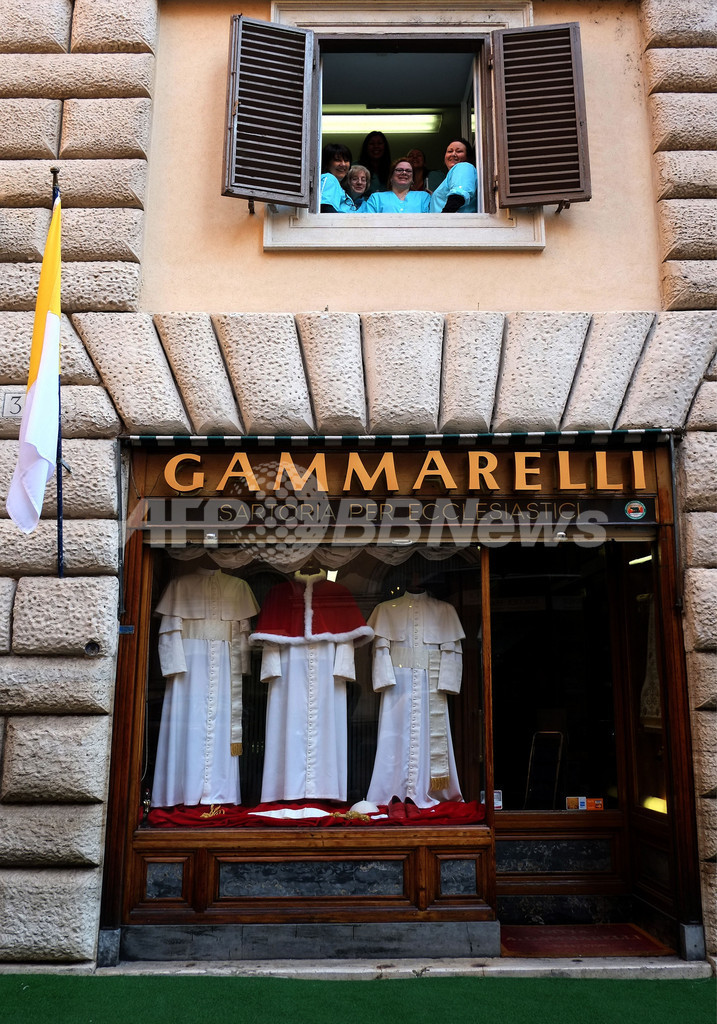 歴代法王の祭服を用意することは「ガンマレッリ」の専門職人たちが長らく続けてきたデリケートな仕事だ。パンテオン(Pantheon)に近いローマ中心街の小道に面した店内の壁には、祭服を提供した歴代法王たちの肖像画と「バチカン(ローマ法王庁、Vatican)御用達」の証明書が誇らしげに掲げられている。