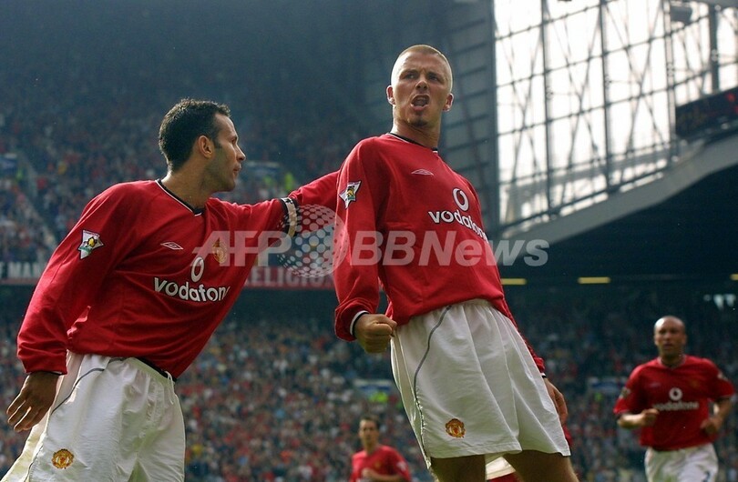 フラム(Fulham)との試合で得点を挙げたデビッド・ベッカム(David Beckham)を祝福するライアン・ギグス(2001年8月19日撮影)。(c)AFP/Odd ANDERSEN