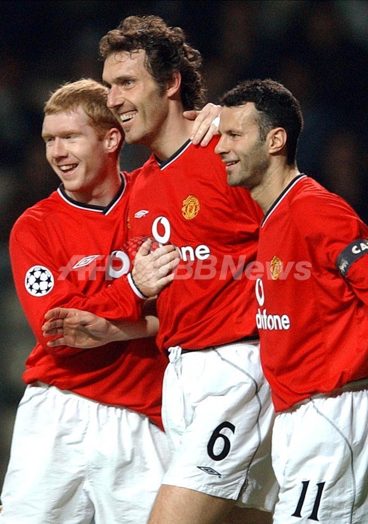 ボアビスタ(Boavista)との欧州チャンピオンズリーグ(UEFA Champions League)でチームメイトのポール・スコールズ(Paul Scholes、左)とともに得点を挙げたローラン・ブラン(Laurent Blanc、中央)を祝福するライアン・ギグス(2002年3月19日撮影)。(c)AFP/ANTONIO SIMOES