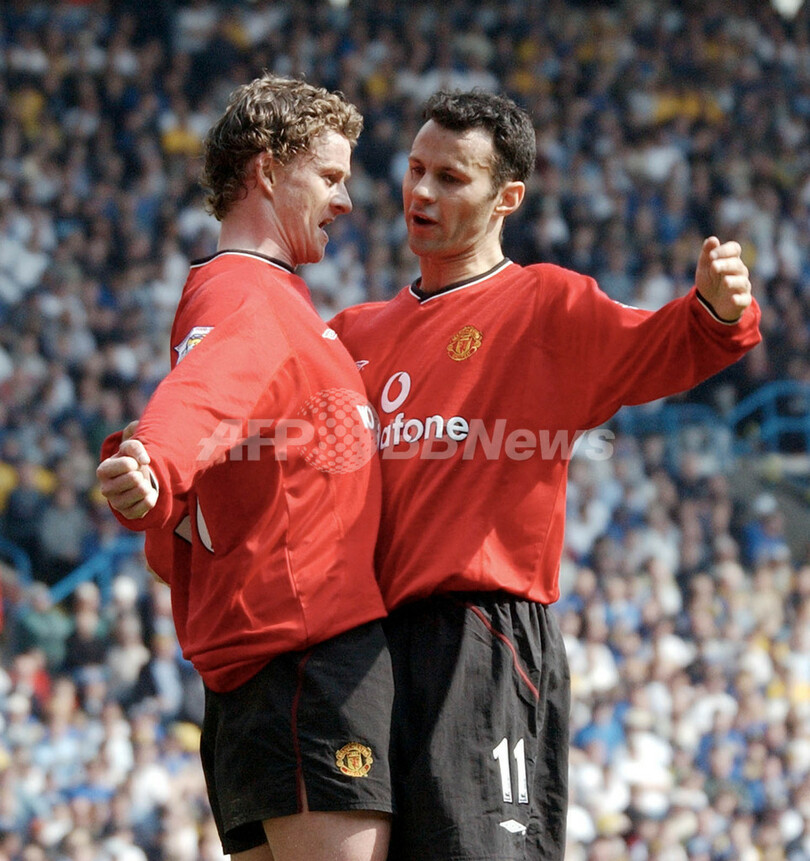 リーズ・ユナイテッド(Leeds United)との試合でチームメイトのオレ・グンナー・スールシャール(Ole Gunnar Solskjaer)と得点の喜びを分かち合うライアン・ギグス(2002年3月30日撮影)。(c)AFP/PAUL BARKER